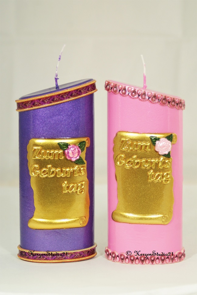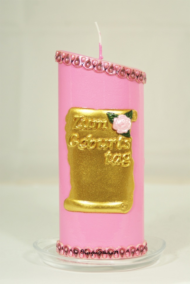 Die Kerze ist verziert einer rosafarbenen Wachsbordüre, Wachsauflage "Schriftrolle", Blattgrün, kleiner rosafarbenen Rosenblüte und Wachsschriftzug "Zum Geburtstag". Auf der Schriftrolle wurde Platz gelassen für die Lebensjahreszahl. Bitte geben Sie die Jahreszahl im Bestellvorgang im Kommentarfeld an. Falls nichts angegeben ist, wird die Kerze wie abgebildet geliefert.