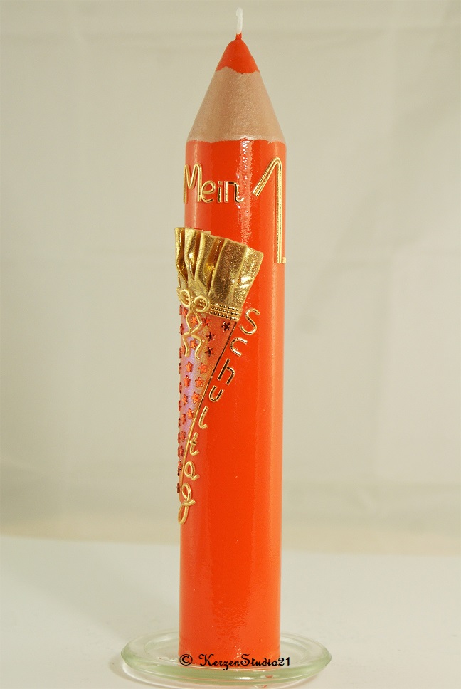 Kerze verziert mit Schultüte glimmer-orange-irisierend/gold, Schriftzug "Mein 1. Schultag" gold. Die Schultüte ist zusätzlich mit orange-farbenen Schmuckstein-Blüten in Sternenform verziert.