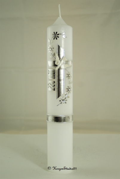 Motiv Kreuz abgeschrägt antik-silber, Ranken und Blätter silber/glimmersilber, Blüten antik-silber, verziert mit kristallenen Schmucksteinen, Taube weiss, Fische glimmersilber, Wellen silber, Wachsband antik-silber.