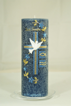 Motiv Kreuz metallic-blau/gold, Blüten metallic-blau verziert mit Schmucksteine Blüte hellblau, Ranke gold, Blätter glimmergold, Fisch und Wasser metallic-blau/gold, Taube weiss, Schriftzug "Zur Taufe" gold.