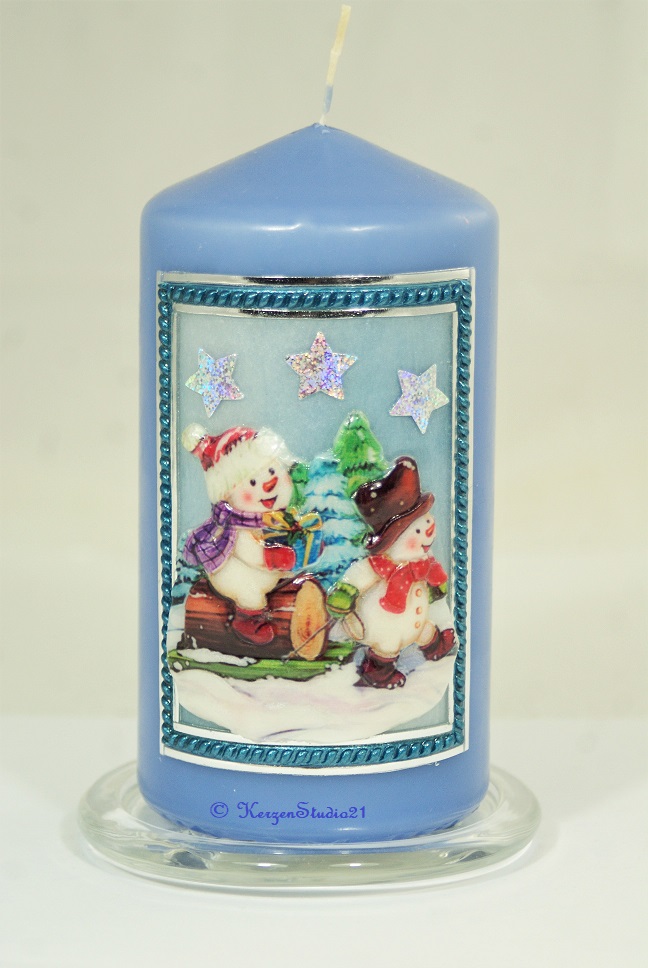 Die Kerze ist verziert mit einem blau-weisen Batik-Ausschnitt, silberner und blauer Schnüre und wunderschöner geprägter Wachsauflage "Schneemann". Glitzer-silberne Sterne funkeln in vielen verschiedenen Farben. Die Kerze kann noch durch den Schriftzug "Frohe Weihnachten" ergänzt werden (ohne Aufpreis). Wenn nichts angegeben wird, wird die Kerze wie abgebildet geliefert.