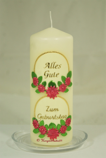 Die Kerze ist verziert mit 2 elfenbeinfarbenen runden Ausschnitten. Die Ausschnitte sind mit goldfarbener Perl-Schnüre gerahmt. In den Ausschnitten wurden die Schriftzüge "Alles Gute" und "Zum Geburtstag" aufgebracht. Abschließend wurden die Ausschnitte verziert mit glimmergrünem Blattgrün und pinkfarbenen Blüten.