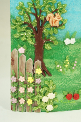 Die Kerze ist handbemalt und verziert mit einem Gartenmotiv. Die Kerze wurde mit Wiese und Himmel handbemalt und anschließend weiter verziert mit einem Gartenzaun, Bäumen, Blumen, Blütenranken, Eichhörnchen, Igel, Katze und Vögel. Zum Schluss wurde ein goldener Geburtstags-Schriftzug aufgebracht, dieser Schriftzug kann natürlich auf Wunsch geändert oder auch ganz weggelassen werden.