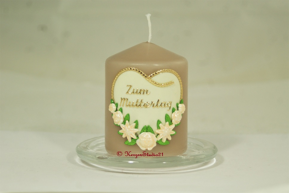 Die Kerze ist verziert mit einem elfenbeinfarbenen Herzausschnitt, goldener Perlschnüre, glimmergrünem Blattgrün und wunderschönen apricotfarbenen Rosen und anderen Blüten. Der Schriftzug "Zum Muttertag" rundet das Motiv ab.