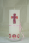 Die Kerze ist verziert mit einem Kreuz in lila/rosa/silber/silber, Kreise lila/rosa/silber/silber mit Anker, Herz, Fische und Wasser, Spitzenband in weiss/hellrosa.