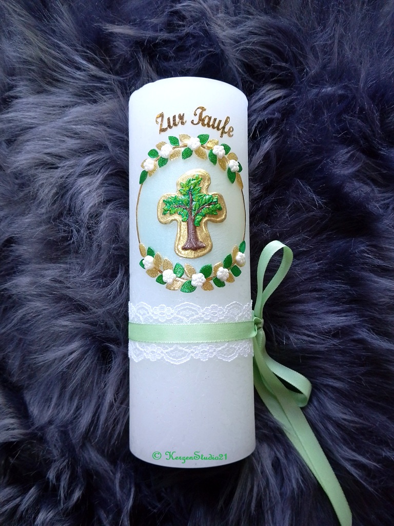 Die Kerze ist verziert mit einem runden Batik-Ausschnitt, Blätter in glimmergold/glimmergrün, weissen Blüten und einem handbemalten Kreuz mit Lebensbaum. Unten ist die Kerze mit einem weissen Spitzenband und grünem Satinband verziert. Unter den Bändern wurde Platz für die Beschriftung gelassen.