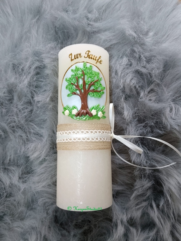 Die Kerze ist verziert mit einem runden Ausschnitt, einem wunderschönen Lebensbaum auf einer Blumenwiese und Schriftzug "Zur Taufe". Die Spitzenbänder runden das Motiv ab.
