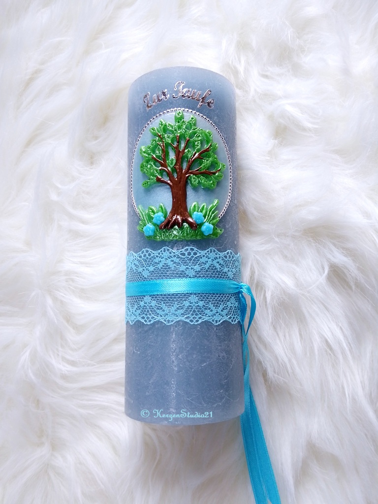 Die Kerze ist verziert mit einem runden Ausschnitt, einem wunderschönen Lebensbaum auf einer Blumenwiese und Schriftzug "Zur Taufe". Die Spitzenbänder runden das Motiv ab.