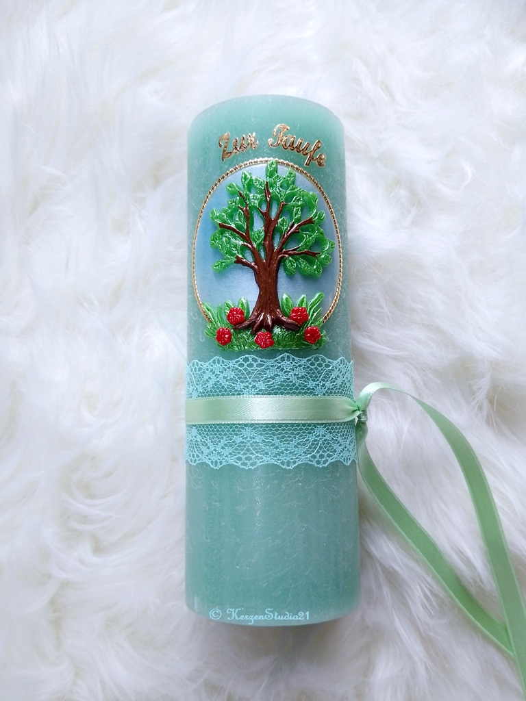 Die Kerze ist verziert mit einem runden Ausschnitt, einem wunderschönen Lebensbaum auf einer Blumenwiese und Schriftzug "Zur Taufe". Die Spitzenbänder runden das Motiv ab.