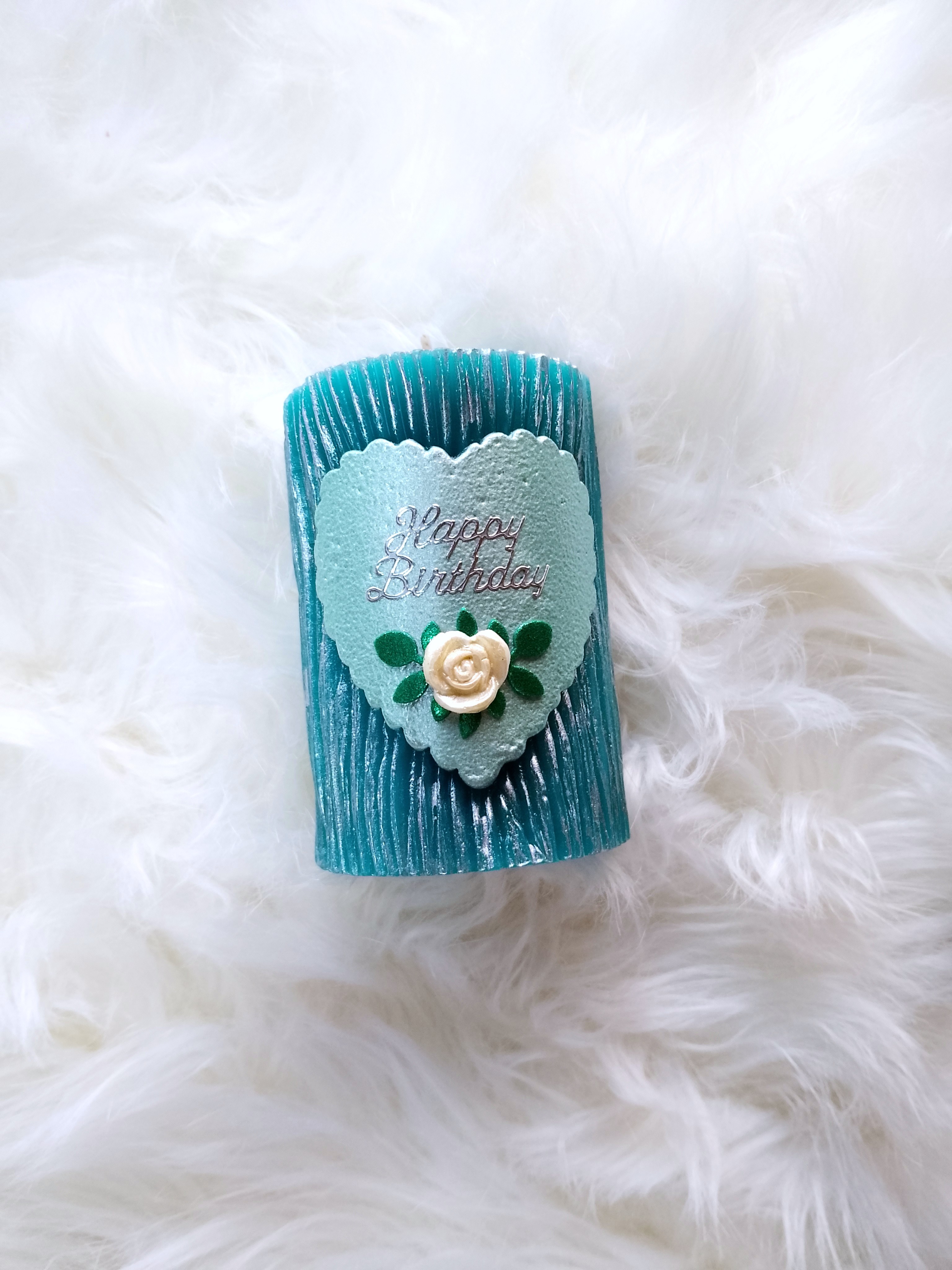 Auf die Kerze wurde ein gewelltes Herz und eine Struktur aufgeschnitzt. Anschließend wurde das Herz weiterverziert mit glimmergrünem Blattgrün, einer cremefarbenen Rosenblüte und einem silberfarbenem Schriftzug "Happy Birthday". Der Struktur wurde ein silber Schimmer verpasst.