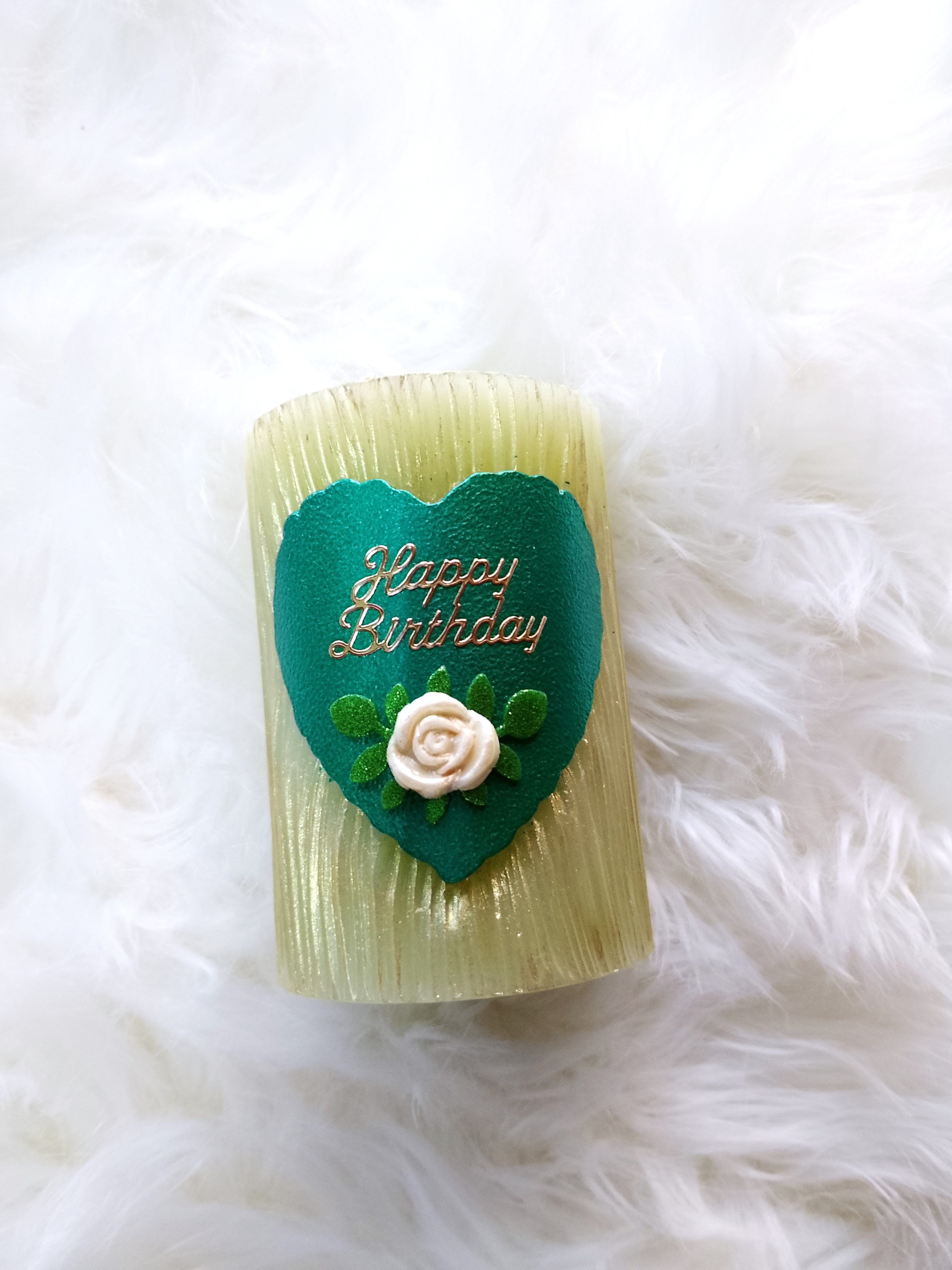 Auf die Kerze wurde ein gewelltes Herz und eine Struktur aufgeschnitzt. Anschließend wurde das Herz weiterverziert mit glimmergrünem Blattgrün, einer Rosenblüte und einem goldfarbenem Schriftzug "Happy Birthday". Der Struktur wurde ein goldener Schimmer verpasst.