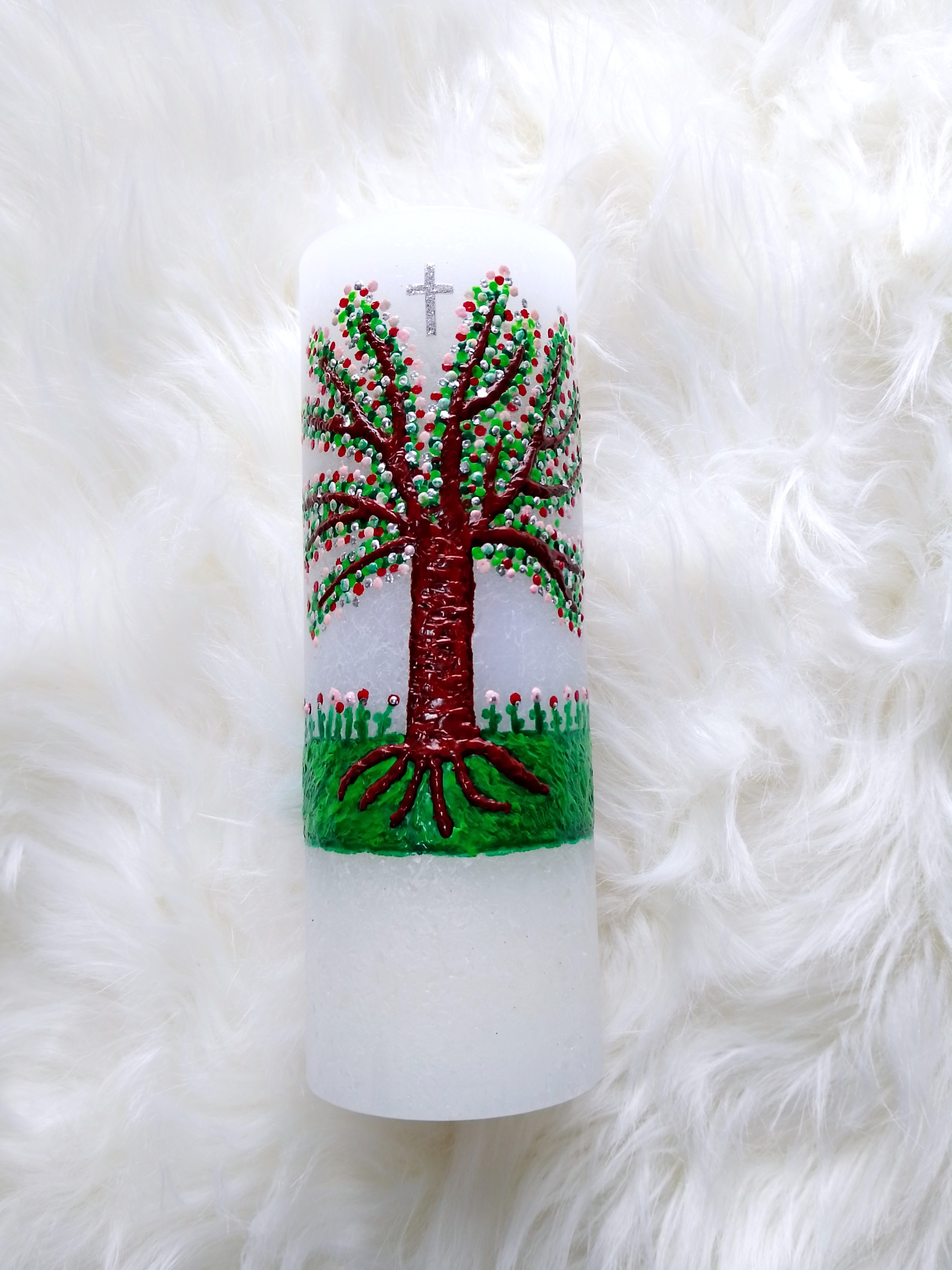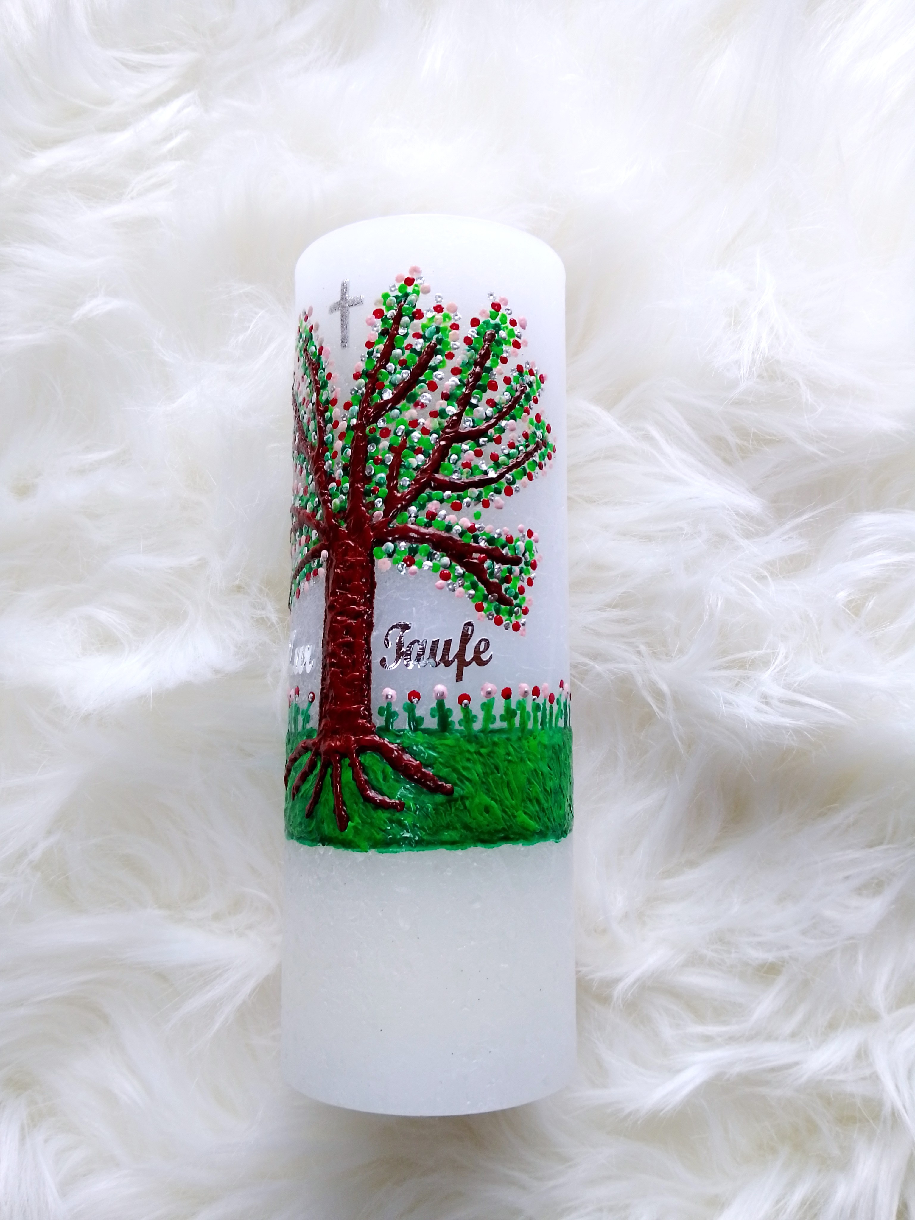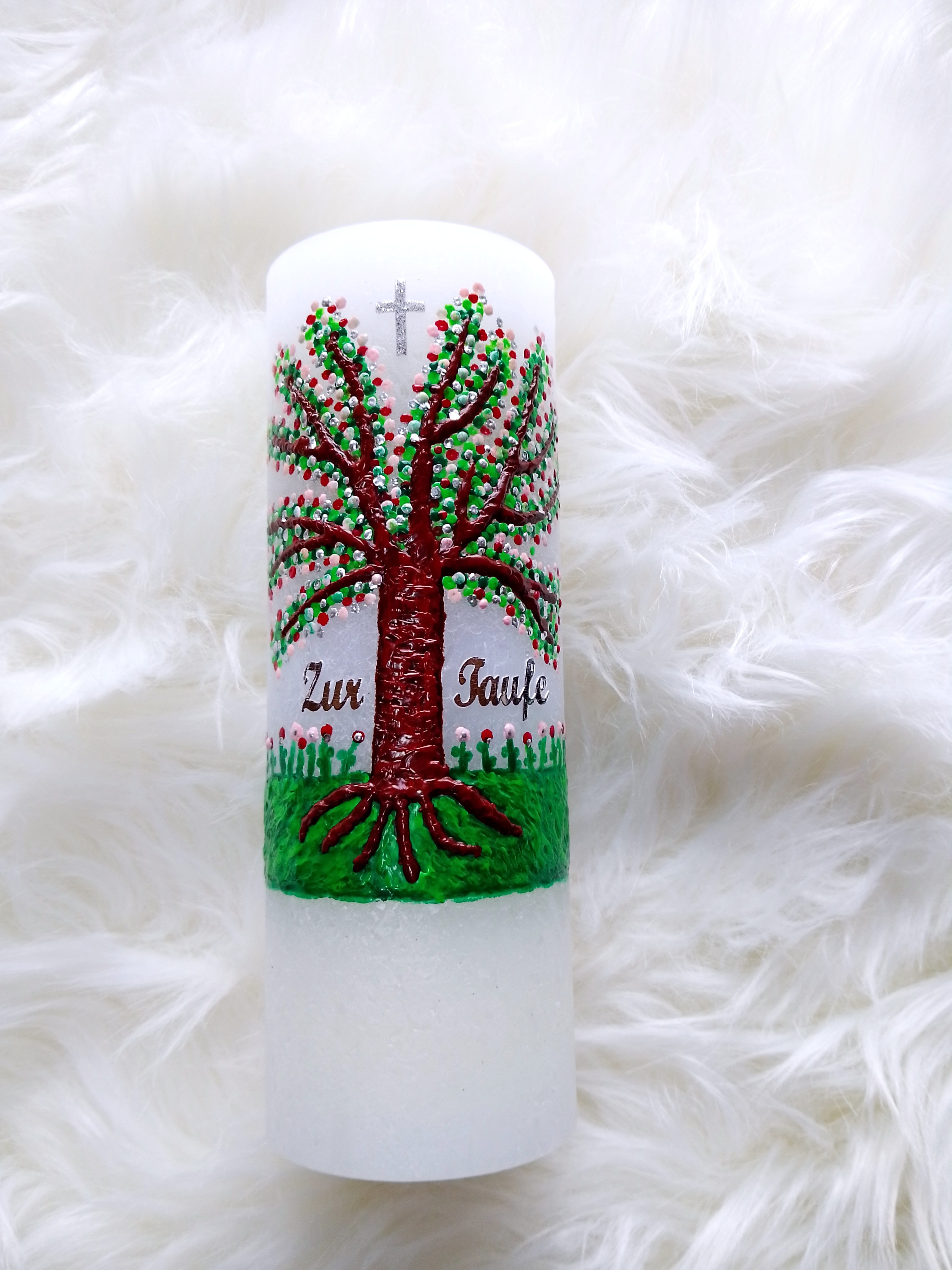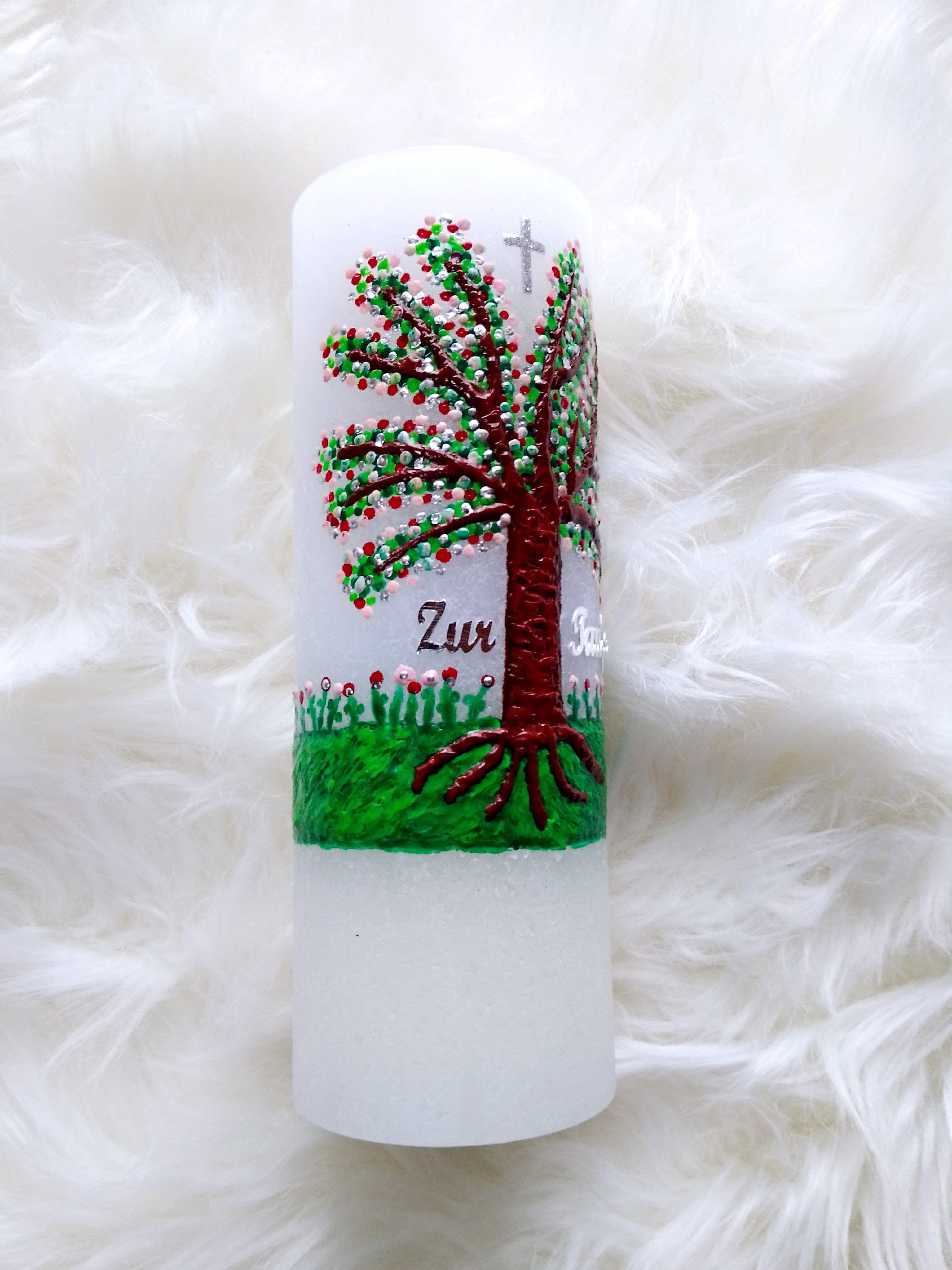 Die Kerze ist verziert mit einem wunderschönen Lebensbaum auf einer Blumenwiese. Das Motiv wurde aus hochwertigem pigmentierten Bienenwachs direkt auf die Kerze gebrannt und ist sehr plastisch. Die Farben im Motiv sind versch. Grün, Rot, Rosa, Silber. Zwischen den Zweigen wurde ein glimmersilbernes Kreuz aufgebracht. Der Schriftzug "Zur Taufe" rundet das Motiv ab.