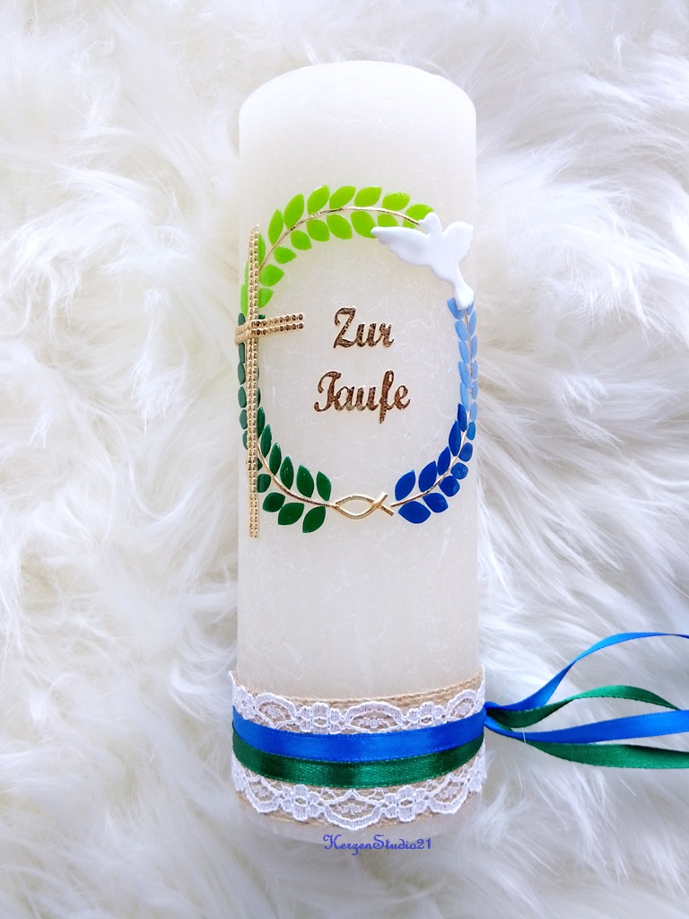 Die Kerze ist verziert mit einem Blätterkranz mit Farbverlauf, geperltem goldenem Kreuz, kleinem Fisch gold, weiße Taube und Schriftzug "Zur Taufe". Die Bänder runden die Kerze ab. Zwischen dem Kranz und den Bändern wurde Platz für die Beschriftung gelassen.