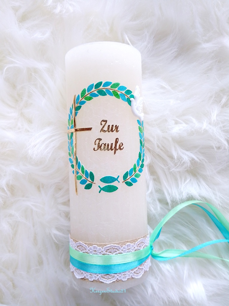 Die Kerze ist verziert mit einem Blätterkranz mit Farbverlauf, spiegelgoldenem Kreuz, zwei kleinen bunten Fischen, weiße Taube und Schriftzug "Zur Taufe". Die Bänder runden die Kerze ab. Zwischen dem Kranz und den Bändern wurde Platz für die Beschriftung gelassen.