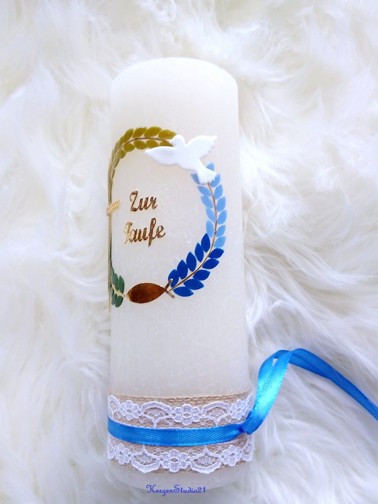 Die Kerze ist verziert mit einem Blätterkranz mit Farbverlauf in grün/blau, geperltem goldenem Kreuz, spiegelgoldenem Fisch, weiße Taube und Schriftzug "Zur Taufe". Die Bänder runden die Kerze ab. Zwischen dem Kranz und den Bändern wurde Platz für die Beschriftung gelassen.