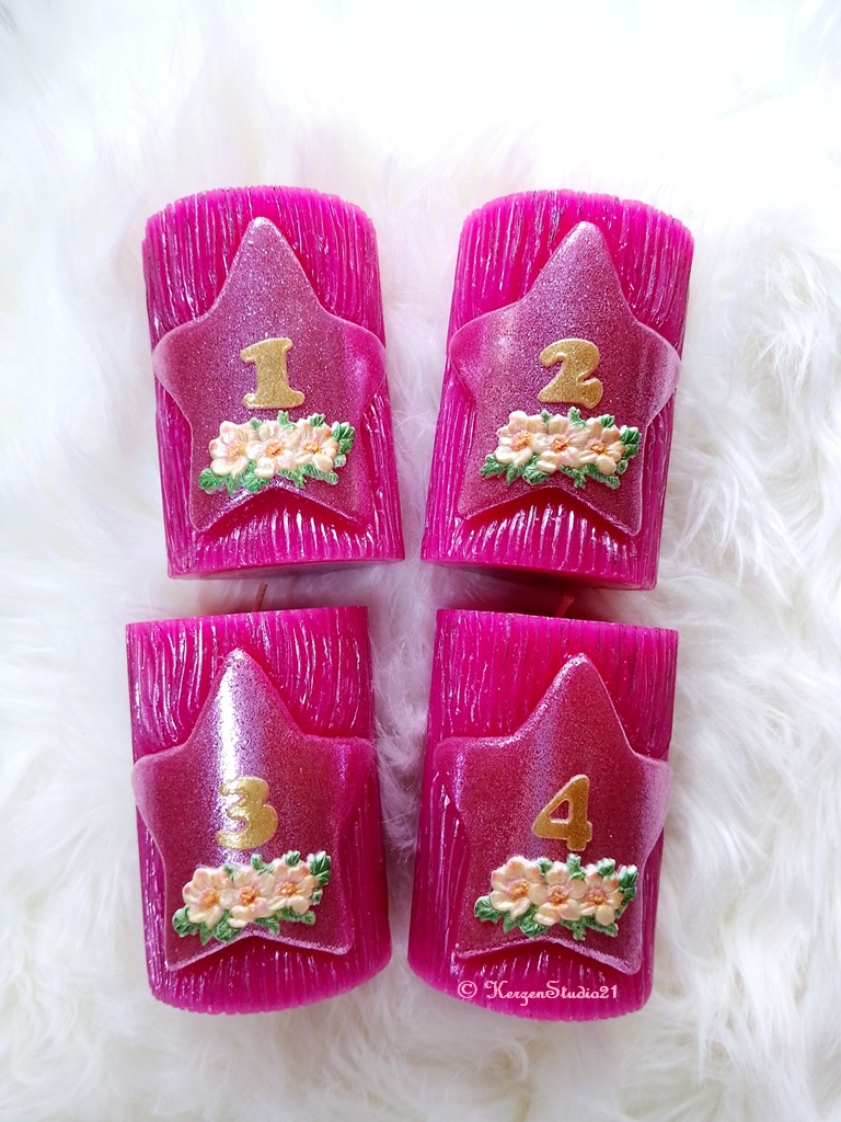 Auf die Kerzen wurde ein Stern und Struktur aufgeschnitzt. Anschließend wurden die Sterne mit Glimmerwachsplatte bezogen, mit wunderschönen Wachsornamenten und glimmer-goldenen Zahlen versehen. Die Struktur wurde mit metallic-rosa verziert.