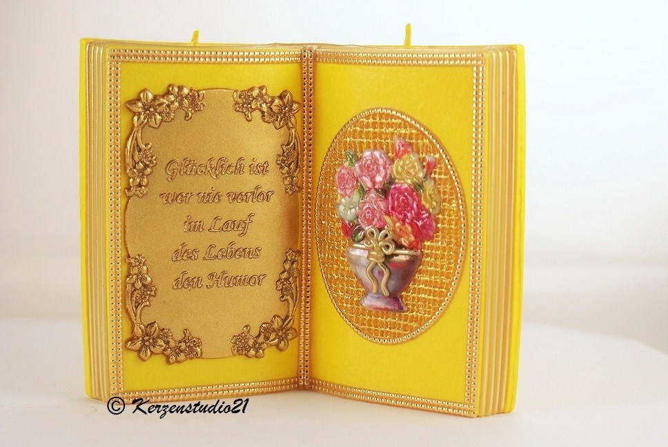 Kerze aufgeschlagene Buchform, Farbe gelb.