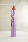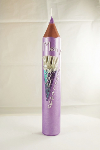 Kerze verziert mit aus Wachs modellierter Schultüte in glimmerlila-irisierend / silber-irisierend, Schriftzug "Mein 1. Schultag" aus silberfarbener Wachsschnüre. Die Schultüte ist zusätzlich verziert mit lilafarbenen Schmucksteinen in Stern-Blüten-Form. Durch das Irisierende schimmert die Schultüte neben lila in leicht hellbläulichen Tönen.