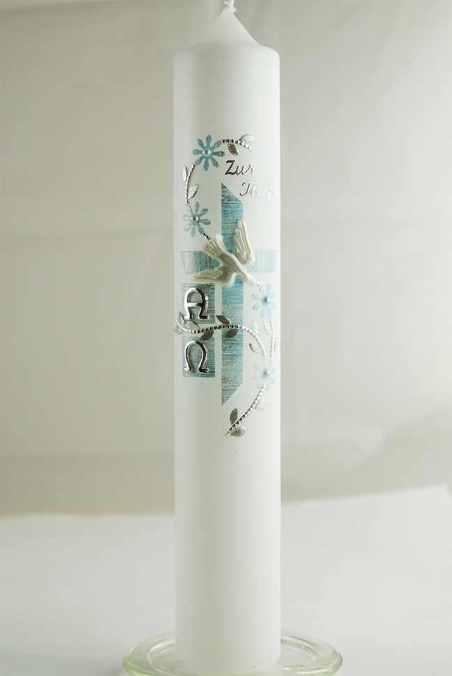 Motiv Kreuz hellblau/silber, Ranke u. Blätter silber, Blüten hellblau/silber verziert mit Halbperlen matt, Alpha u. Omega hellblau/silber, Taube weiss, Schriftzug "Zur Taufe" silber.