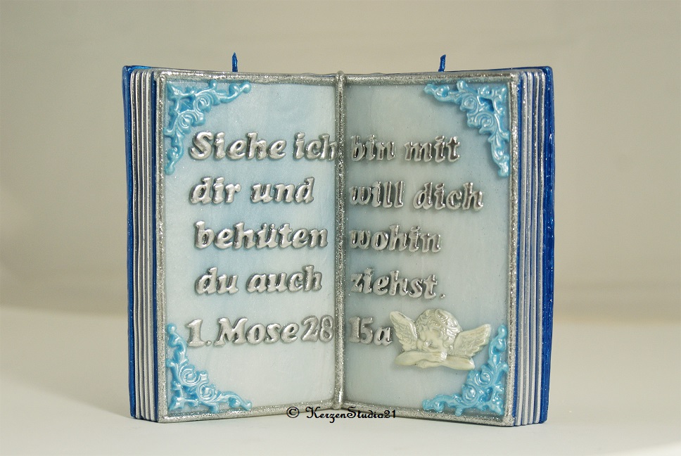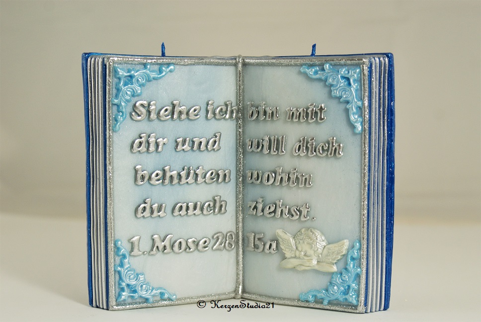 Die Vorderseiten sind verziert mit hellblauen Eckornamenten und einem Taufspruch in silberfarbenen Wachsbuchstaben, der über beide Seiten geschrieben ist. Neben dem Spruch wurde ein antik-silberfarbener Wachsengel platziert.
