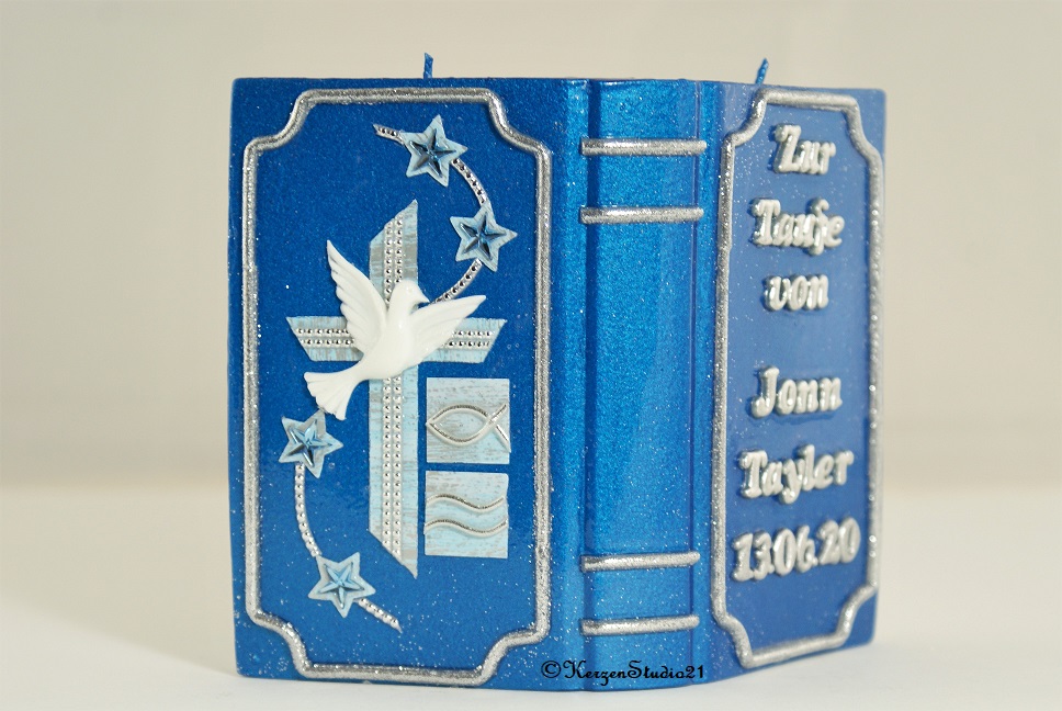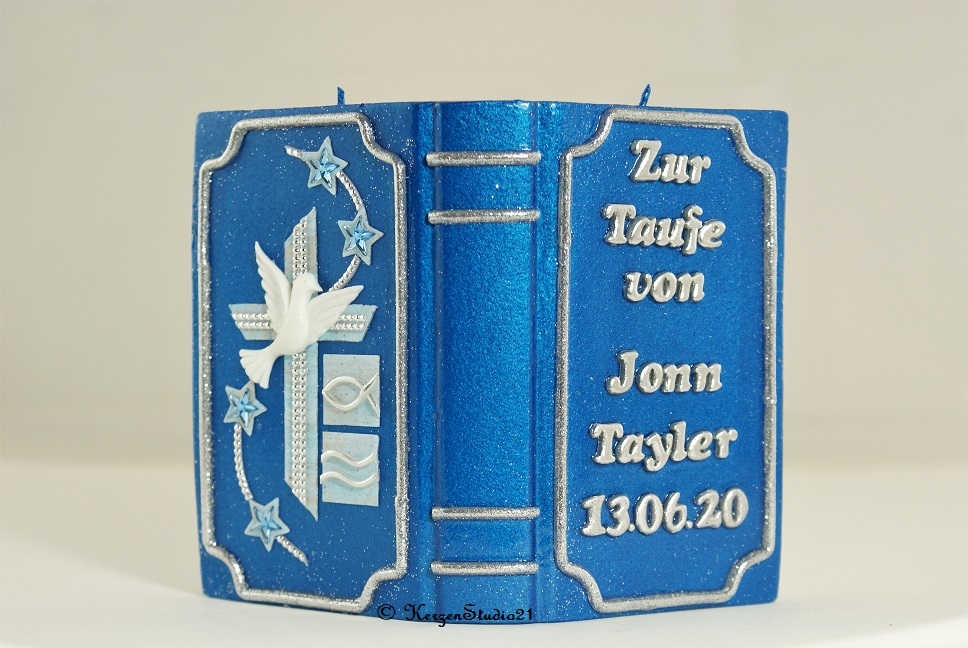 Die Aussenseiten sind verziert mit silberfarbener Schnüre, einem Kreuz in hellblau/silber/silber, Ranke perlsilber, Sterne hellblau/silber mit hellblauen Schmucksteinen in Sternenform, Fisch und Wasser in hellblau/silber/silber, Taube weiss, Schriftzug "Zur Taufe von" aus Wachsbuchstaben silber und Name u. Datum aus Wachsbuchstaben silber.